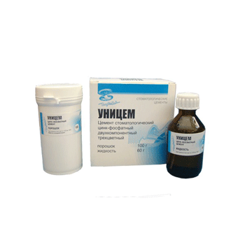 Стеклоиономерный цемент «Цемион-Ф» образуется при смешивании порошка и жидкости. Порошок представляет собой измельченное алюмофторсиликатное стекло, жидкость – водный раствор полиакриловой кислоты. «Цемион-Ф» рентгеноконтрастен, обладает высокой механической прочностью, низкой растворимостью, хорошей адгезией к эмали, дентину и к основным конструкционным стоматологическим материалам. Материал обеспечивает хорошую краевую герметизацию, длительно выделяет фтор, что укрепляет твердые ткани зуба и предупреждает развитие вторичного кариеса. Стеклоиономерный цемент «Цемион-Ф» не вызывает болевых ощущений у пациента при фиксации коронок и мостовидных протезов. | Уницем (Unicem) |